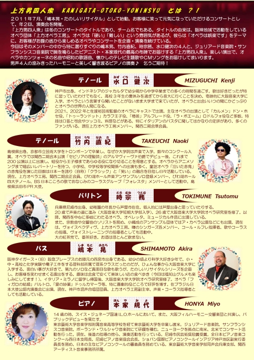 男声オペラ歌手4人の澄みきったハーモニーと美しく響き渡るピアノの演奏で、皆様におなじみのオペラやカンツォ―ネの名曲や昭和の歌謡曲、懐かしのテレビ主題歌やCMソングなどを楽しい演出でお届けします。